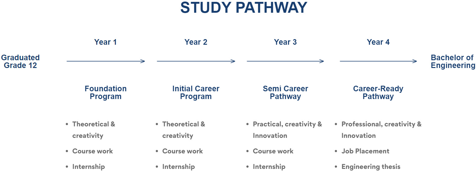 The 4-Year Bachelor’s Degree program contains 160 credit combing 134 credits of coursework and 26 credits of internship and thesis defense. The courses are divided into six categories, including Common Courses , Specialized Courses, Elective Courses, Internship Projects, Placement, and final thesis defence.